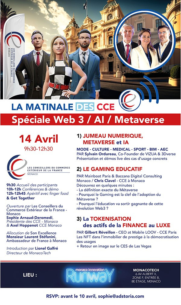 Une invitation de MonacoTech et les Conseillers du Commerce Extérieure de la France:Conférence IA/Web3/MetaverseApril 14 9.30-12.30hRSVP avant le 10 avril: sophie@adtoria.com